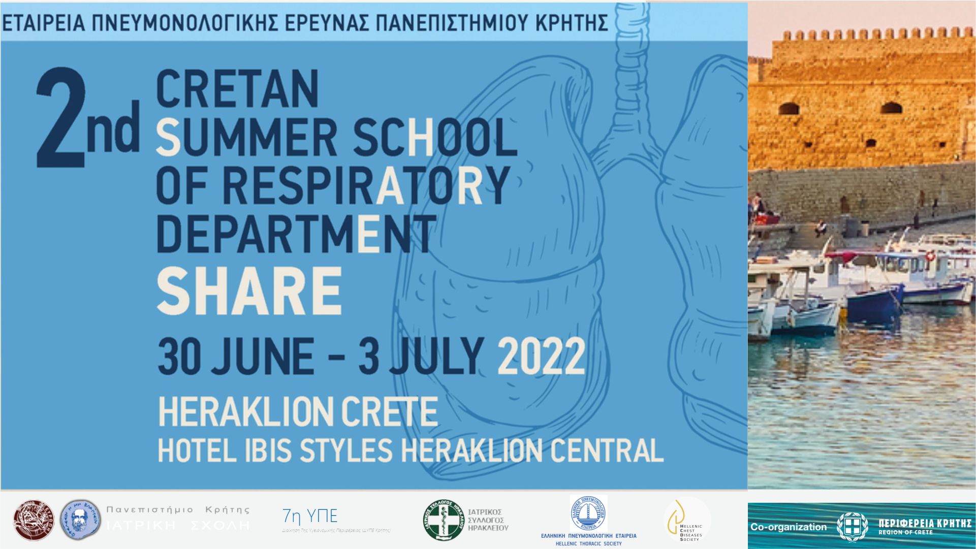 The 2nd Cretan Summer School of Respiratory Department SHARE; from bench to bedside is targeting to teach medical doctors and researchers the latest advancements of Respiratory diseases covering theory, multidisciplinary discussions between clinicians- respiratory and primary care physicians, rheumatologists and expert radiologists and pathologists, difficult for diagnosis and management clinical cases.