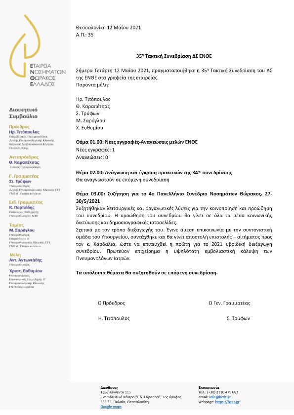 Σήμερα Τετάρτη 12 Μαΐου 2021, πραγματοποιήθηκε η 35η Τακτική Συνεδρίαση του ΔΣ της ΕΝΘΕ στα γραφεία της εταιρείας.