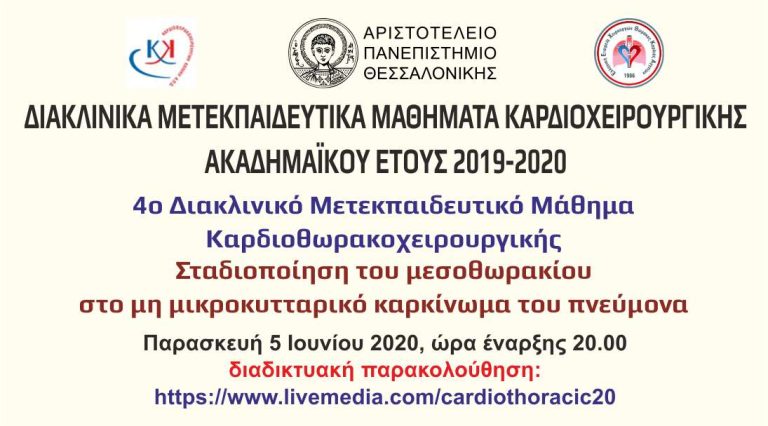 Επανέναρξη των Μετεκπαιδευτικών Μαθημάτων της Καρδιοθωρακοχειρουργικής Κλινικής του ΑΠΘ την 5-6-2020 και ώρες 20.00-22.30