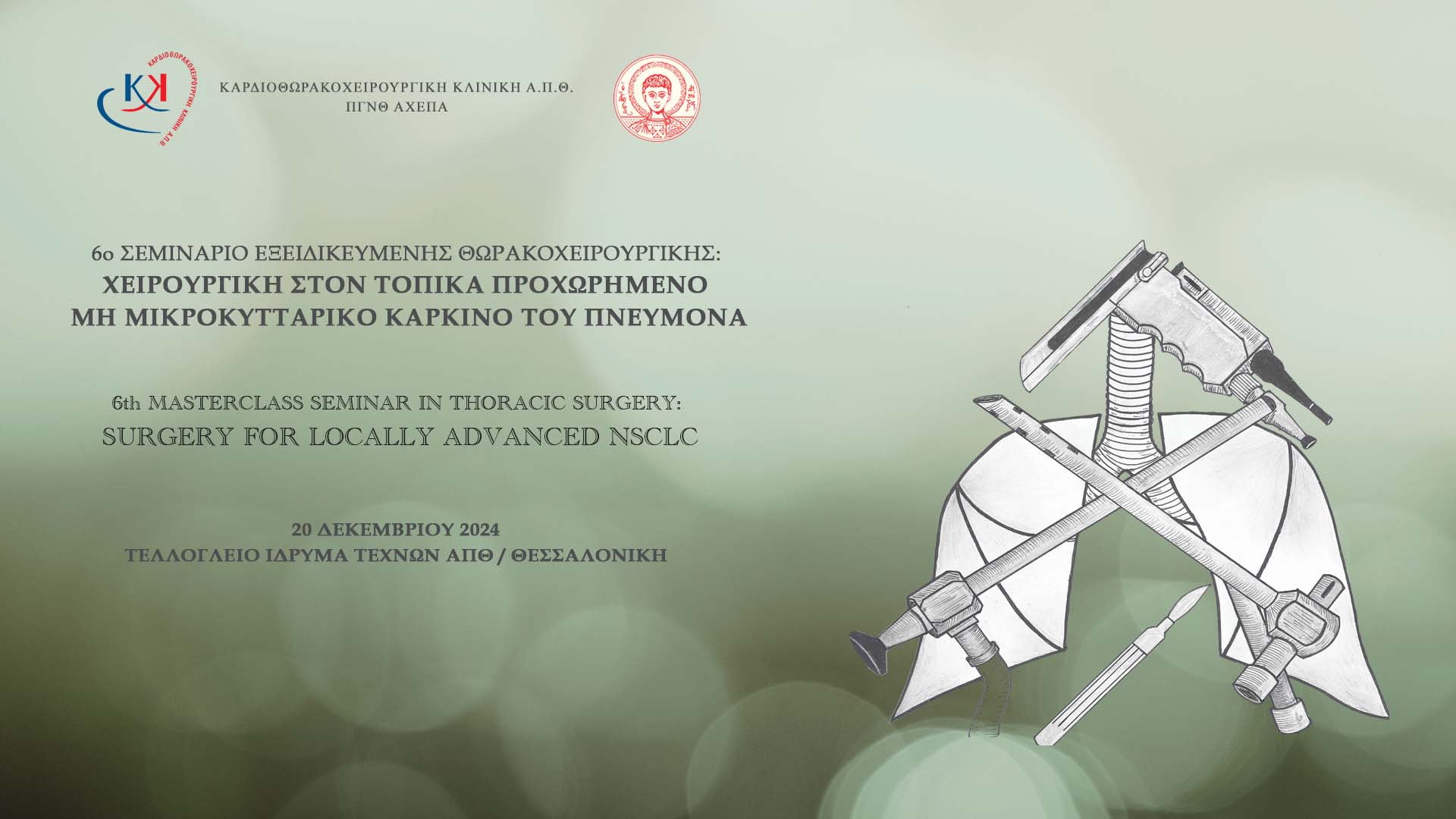 Tο Σεμινάριο Εξειδικευμένης Θωρακοχειρουργικής: «Χειρουργική στον Τοπικά Προχωρημένο μη Μικροκυτταρικό Καρκίνο του Πνεύμονα» θα πραγματοποιηθεί στις 20 Δεκεμβρίου 2024 στο Τελλόγλειο Ίδρυμα Τεχνών ΑΠΘ, στη Θεσσαλονίκη, από την Καρδιοθωρακοχειρουργική Κλινική ΑΠΘ.