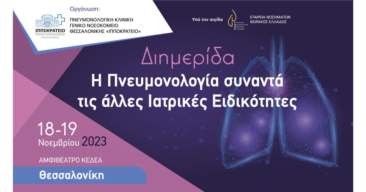 Η Πνευμονολογική Κλινική του ΓΝΘ Ιπποκρατείου θα πραγματοποιήσει στις 18-19 Νοεμβρίου 2023 στο αμφιθέατρο ΚΕΔΕΑ ΑΠΘ, την διημερίδα: “Η Πνευμονολογία συναντά τις άλλες Ιατρικές Ειδικότητες”.