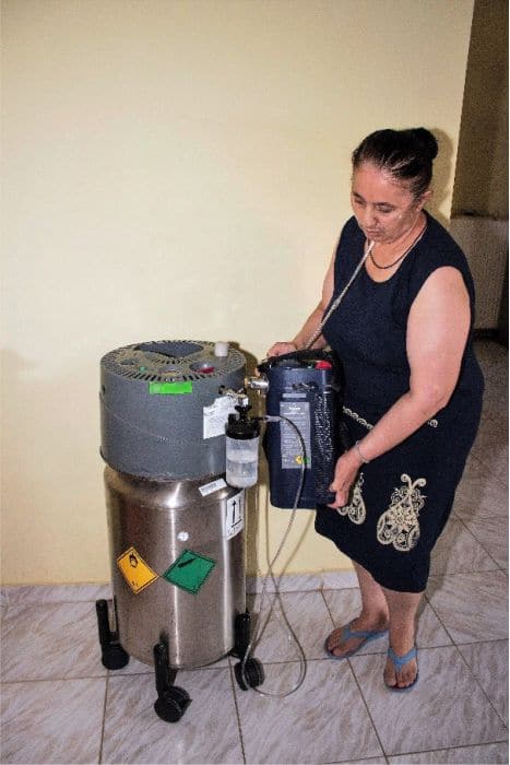 Ασθενής που χρησιμοποιεί υγρό οξυγόνο για την οξυγονοθεραπεία της