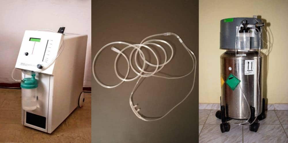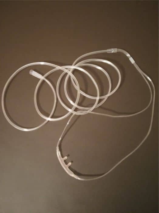 Στο δοχείο αυτό συνδέεται ένας διάφανος σωλήνας που καταλήγει σε δύο μικρά κυρτά σωληνάκια. Αυτά τα σωληνάκια ονομάζονται ρινικοί καθετήρες και τοποθετούνται στα ρουθούνια του ασθενούς, ενώ ο διάφανος σωλήνας περνάει πίσω από τα αυτιά του ασθενούς και στερεώνεται κάτω από το πηγούνι του, όπως φαίνεται στις παρακάτω φωτογραφίες. Ο διάφανος σωλήνας με τους ρινικούς καθετήρες μεταφέρει το οξυγόνο από την «πηγή» στον ασθενή.