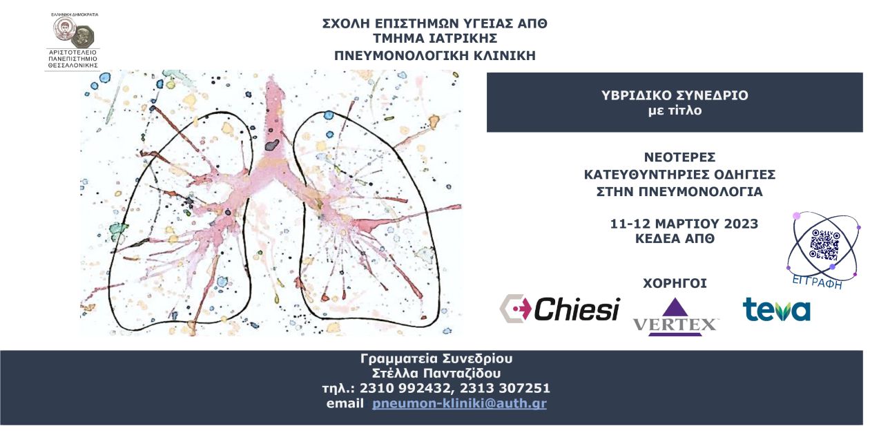 Θα θέλαμε να σας προσκαλέσουμε στο συνέδριο με τίτλο «Νεότερες Κατευθυντήριες Οδηγίες στην Πνευμονολογία», που θα διεξαχθεί σε υβριδική μορφή στις 11 και 12 Μαρτίου 2023. Το συνέδριο αυτό αποτελεί το 3ο μέρος της σειράς επιστημονικών εκδηλώσεων που διοργανώνει η Πνευμονολογική Κλινική ΑΠΘ, για την ενημέρωση ιδιαίτερα των νεότερων συναδέλφων σε πρακτικά θέματα κλινικής αντιμετώπισης των συνηθέστερων πνευμονολογικών νοσημάτων.