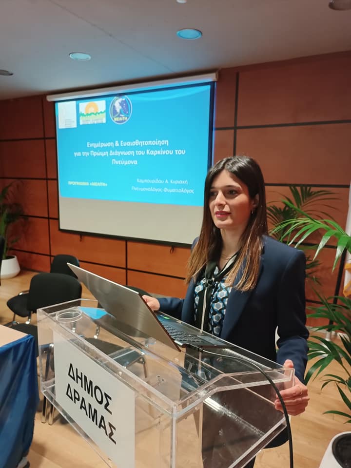 Στο πλαίσιο του πανελληνίου προγράμματος ενημέρωσης και ευαισθητοποίησης του πολίτη, “Μελίτη”, το Τμήμα Προστασίας και Προαγωγής της Δημόσιας Υγείας του Δήμου Δράμας πραγματοποίησε ημερίδα για την έγκαιρη διάγνωση του καρκίνου του πνεύμονα, την Παρασκευή 5 Μαΐου 2023, στην αίθουσα πολλαπλών χρήσεων στο ισόγειο του Δημαρχείου με ομιλήτρια την πνευμονολόγο κα Κυριακή Καμπουρίδου.