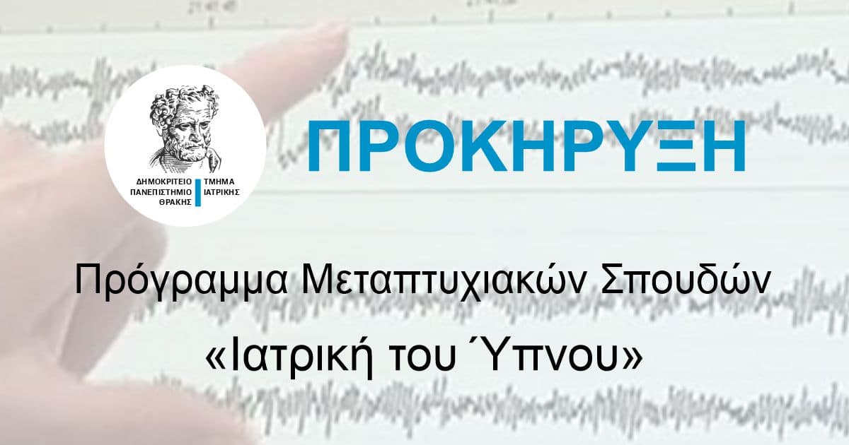 Το Τμήμα Ιατρικής του Δημοκρίτειου Πανεπιστημίου Θράκης (Δ.Π.Θ.) κατά το Ακαδημαϊκό έτος 2021-2022 διοργανώνει το Πρόγραμμα Μεταπτυχιακών Σπουδών (Π.Μ.Σ.), διάρκειας 18 μηνών, με γνωστικό αντικείμενο «Ιατρική του Ύπνου».