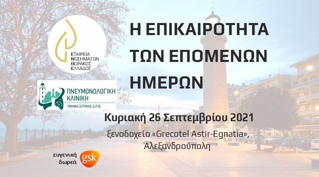 Η Εταιρεία Νοσημάτων Θώρακος Ελλάδος, διοργανώνει επιστημονική εκδήλωση με τίτλο “Η Επικαιρότητα των επόμενων ημερών”, την Κυριακή 26 Σεπτεμβρίου 2021, στο ξενοδοχείο Grecotel Astir – Egnatia, στην Αλεξανδρούπολη.