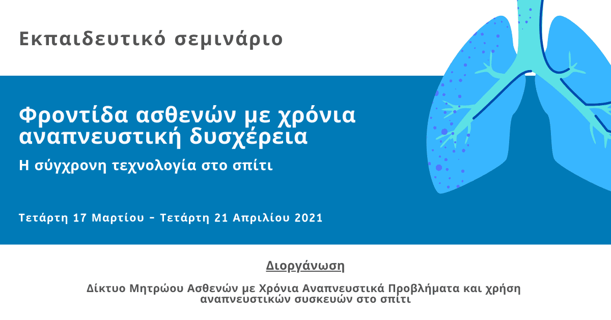 Το Δίκτυο Μητρώου Ασθενών με Χρόνια Αναπνευστικά Προβλήματα και χρήσης αναπνευστικών συσκευών στο σπίτι, που συντονίζεται από το ΙΝΕΒ | ΕΚΕΤΑ σε συνεργασία με την Κλινική Αναπνευστικής Ανεπάρκειας, την Πανεπιστημιακή Πνευμονολογική Κλινική ΑΠΘ, την Πνευμονολογική Κλινική ΕΣΥ Γ. Παπανικολάου και την Παιδοπνευμονολογική Μονάδα Γ Παιδιατρικής Κλινικής ΑΠΘ, σας προσκαλεί να συμμετέχετε στο εκπαιδευτικό σεμινάριο «Φροντίδα ασθενών με χρόνια αναπνευστική δυσχέρεια. Η σύγχρονη τεχνολογία στο σπίτι.»